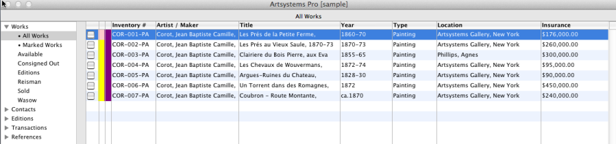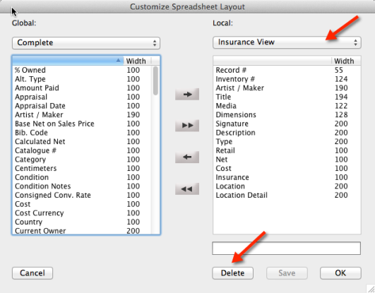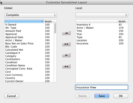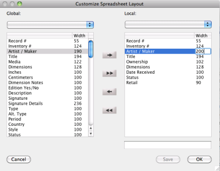 Although Artsystems Pro is delivered with the two default spreadsheet layouts, users can create and save a multitude of customized spreadsheet views to suit any need. To create a new layout begin with one of the views from the Spreadsheet Layout drop-down menu.