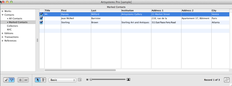 Marked Record Set: A Marked Record Set is a method of grouping records together by adding a checkmark next to the desired records for the set. Records are marked by clicking the first column in the Main Content Screen (or by clicking the Marked box on a record's Detail Screen). The Marked Record Set is then gathered by selecting the first item listed in the open module folder listed in the Module Sidebar: Marked Works, Marked Contacts, Marked Editions, Marked Transactions, Marked References.