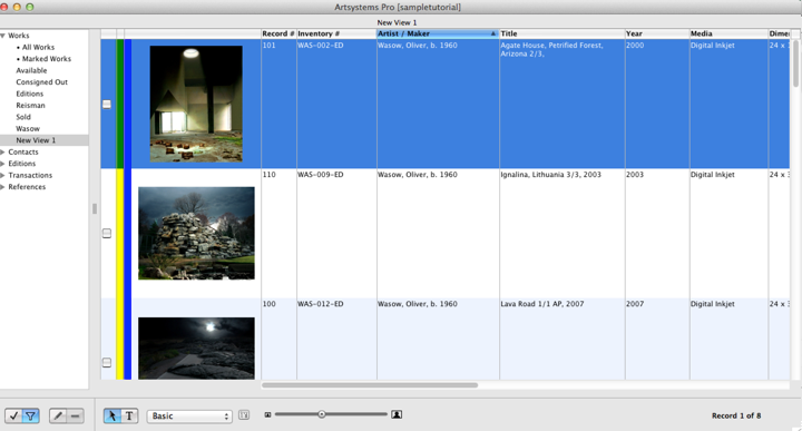 View Set: A View Set is a method of grouping records which have the same attributes or meet a certain criteria, such as all Available work, or all Sold work, or all Contacts who have purchased work by a particular artist. A View Set is a powerful search tool allowing users to select specific criteria for records they are interested in viewing, then Artsystems Pro gathers the precise records that meet the selected criteria to create the data set. View Sets may be saved by simply renaming "New View 1" in the module sidebar folder so they can easily be activated again for future use. A saved View Set is dynamic (automatically updates with changes to database).