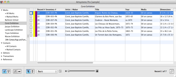Worksheets: A Worksheet is a saved data set that is static (does not change with database updates). Any Marked Records Set may be saved as a Worksheet. A data set saved as a Worksheet can be easily activated any time in the future and is useful for particular lists that require easy access, such as exhibition lists or art fair lists, or works of interest to a collector. Note also that a View Set may be saved as a Worksheet (as long as all works are Marked before saving the group of records as a Worksheet). By saving the View Set as a Worksheet the list will no longer dynamically update with database changes.