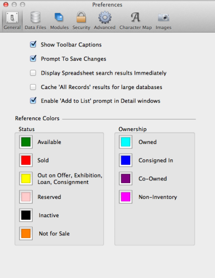 The General Screen in Preferences includes a key to colors that indicate the Status of a Work record: Available, Sold, Out on Offer, Exhibition, Loan, Consignment, Reserved, Inactive and Not for Sale.