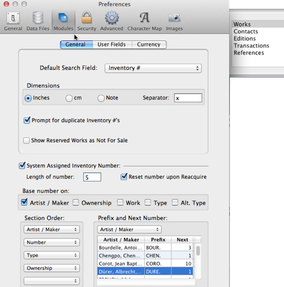 - Base Number on: define the option on which to base the numbering system on: Artist/Maker, Ownership, Work, Type, or Alt.Type.