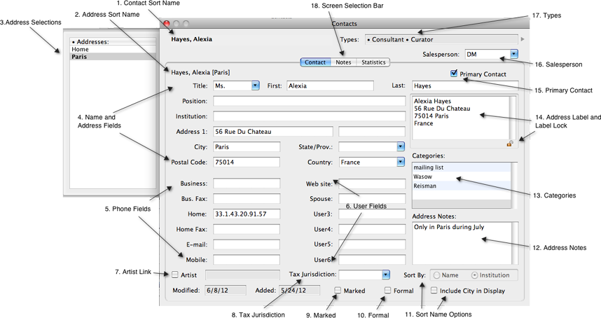 - Screen Selection Bar: The Contacts Screen Selection Bar provides access to additional screens for the Contact record: Contact, Notes and Statistics. The blue background indicates the selected screen. The Contact Screen holds all vital information such as address, phone, types and categories. The Notes Screen is a large Note field for keeping detailed notes about the contact. And the Statistics Screen provides a quick view to see Transaction History for Work History, Work Movement, Payments Received, Outstanding Works, and Payments Made. It also provides a quick Collections view to see all work currently or previously owned by the Contact.