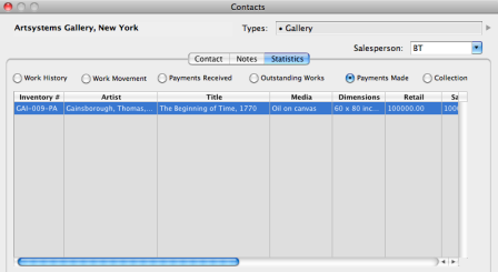 The Payments Made view is for Contacts who are consignors to the database. The view displays links to Payments made to the Contact for sold consigned Work records.