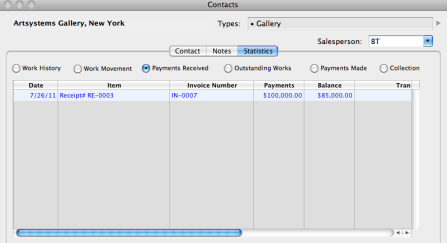 The Payments Received view displays the Contact's links to all payments made by the Contact for artwork purchased (Cash Receipt Transactions).