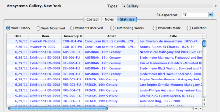 When the Contact Statistics Screen is selected, Work History is the first linked information viewed. It is possible to adjust the first bullet selection to view in Artsystems Pro > Preferences.