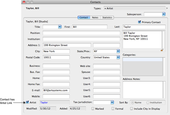 - When the new Contact record is entered, the Artist field will be checked and the linked artist name will appear on the Contacts Detail Screen: