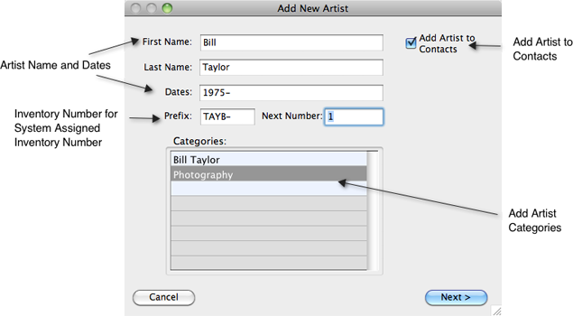 - When the System Assigned Inventory Number option is activated, and the numbering system is based on Artist, a prompt appears on the Add New Artist Screen to add Inventory Number Prefix and Next Number (see also Preferences>System Assigned Inventory Number).