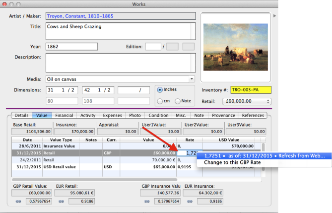 Artsystems Pro users may enter Values in a Non-Home Currency by selecting from the Curr. drop-down field, and the program will convert that Value to the user's Home Currency (that is, the same Currency which is set in the computer's Regions and Languages). The Conversion Rate is saved in the database in Works Module>Edit>Related Lists>Currencies.