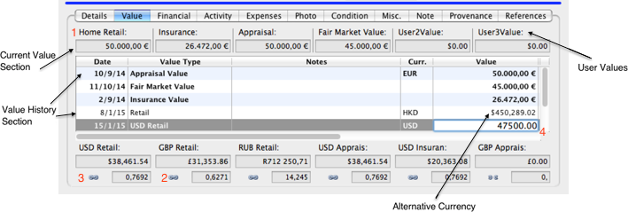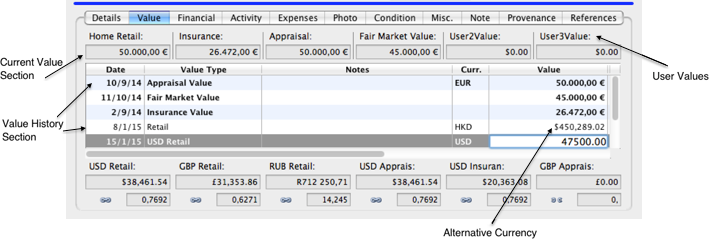 In the example above The Home retail amount is based in EUR. There are six Value Types linked (USD Retail, GBP Retail, RUB Retail, USD Appraisal, USD Insurance, GBP Appraisal)