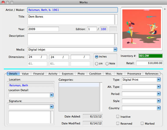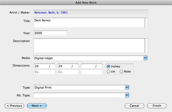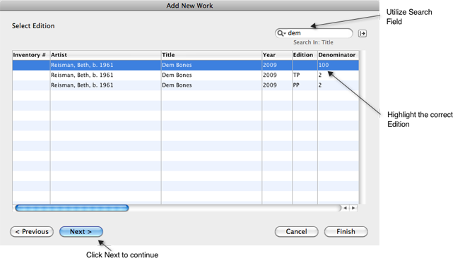 Note About Inventory Numbers: Enter Inventory Number on the Edition record if it is desired for all editioned works to have the same inventory number (this is possible with the System Assigned Inventory Number option turned OFF). For Inventory Numbers to auto-populate with unique numbers, use the System Assigned Inventory Number option. For Inventory Numbers to all be uniform, enter an Inventory Number on the Edition record prior to starting the add new editioned work process (also note the System Assigned Inventory Number option would have to be turned off).