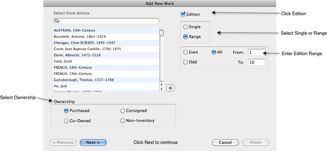 - Single or Range: Select Single to enter one editioned Work, or Range to add multiple editioned Works.
