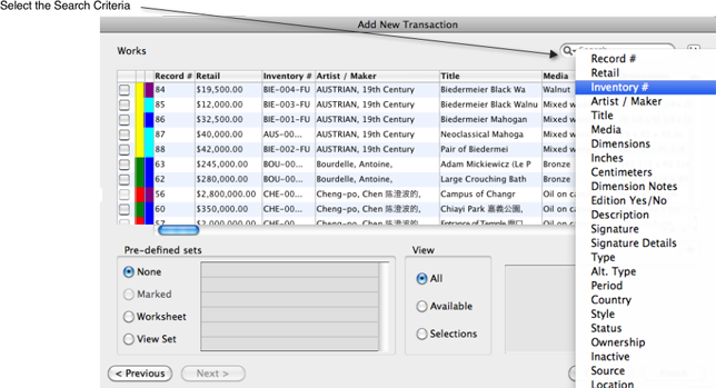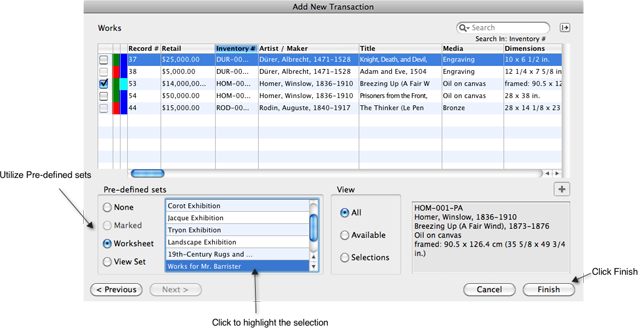 - Marked: Prior to opening the Transactions Module, open the Works Module and mark all the items for any one particular transaction. Then open the Transactions Module and create the new transaction record. In the Transaction Wizard, on the Work Selection Screen, select the Marked option under Pre-defined sets. All Works that were previously Marked in the Works Module will appear Marked in the Work Grid.