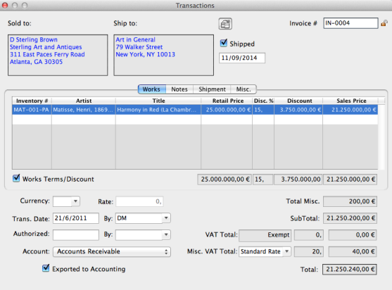 To keep track of inventory locations, click the Shipped field when the artwork in a transaction leaves the premises.