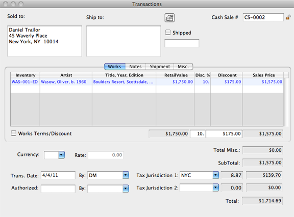 All Transaction records are entered in the same manner. Follow the basic steps for entering Invoice Transactions and find additional information about entering all other Transactions below. Users can also print a Transaction document for all Transactions created in Artsystems Pro.
