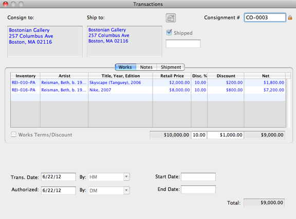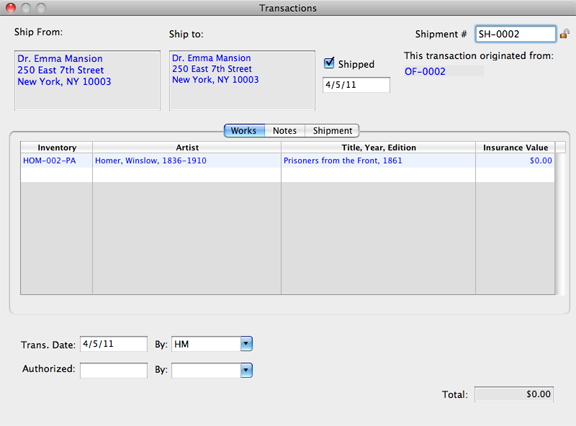 Create Offer Transactions to document artwork offered to Contacts. A Shipped Offer indicates the artwork is out on Approval.