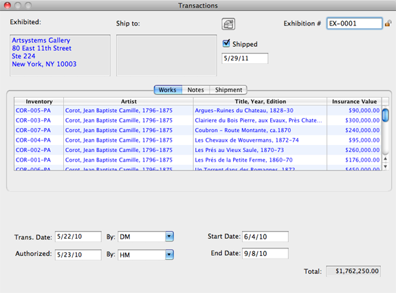Create Exhibition Transactions to document artwork traveling to exhibition.
