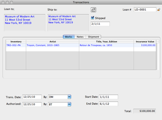 Create Loan Transactions to document artwork traveling out on loan to Framers, Restorers and Museums (when not in a specific Exhibition), etc.