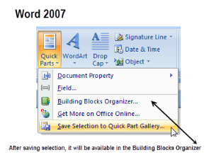 - In Microsoft Word for Windows 2007, 2010 and 2013, use the Quick Parts feature from the Insert menu. After highlighting the text or image in your Document, choose Insert>Quick Parts>Save Selection to Quick Part Gallery>enter the criteria and click OK to save it. The saved text or image will now be accessible from Insert>Quick Parts>Building Blocks Organizer.
