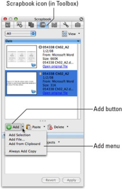 - In Microsoft Word for Mac 2011, use the Scrapbook feature. Highlight the text or image in your Document>select the Toolbox icon>select the Scrapbook icon. Then, you can either drag it onto the Scrapbook or click the Add button and choose Add Selection from the drop-down menu.