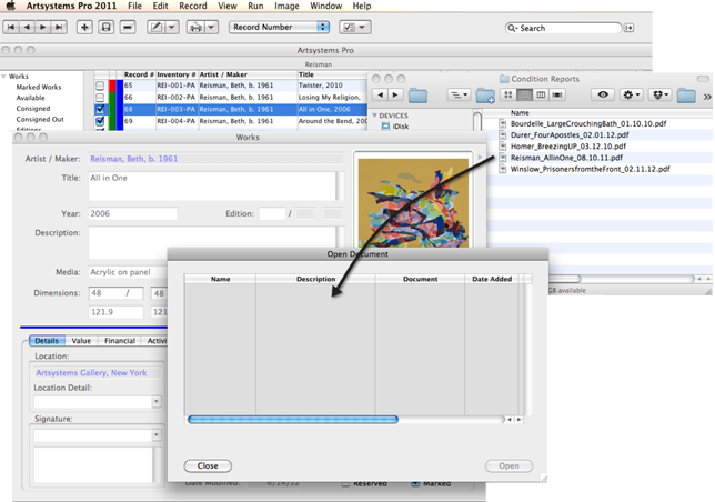 The Document button is a tool to help create word processed documents for a record such as; the Infosheet in the Works Module, a letter or fax in the Contacts Module, and in the Transactions Module any (Invoice, Consignment, Offer, etc). The document can be printed, saved as a separate file on the workstation, or saved within Artsystems Pro (for easy access). Users can also link additional support documentation to records (in various formats: doc, docx, pdf, or jpg files) by dragging and dropping into the Document screen.