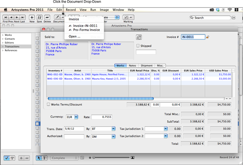 - Transactions: Transaction Document: Generate a corresponding Transaction document for each type of Transaction (i.e. Invoice, Consignment, Offer, Exhibition, Loan, etc.)